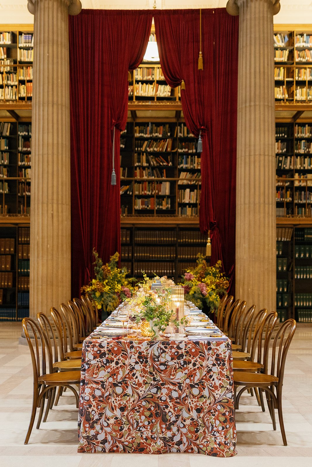 Our Minne Wedding design will beautifully complement this restored, storied landmark with opulent, rich, velvety textures; lush florals and layered greenery; and carefully curated romantic lighting that glows against the marble and stone. Set within a warm winter atmosphere, the overall aesthetic feels intimate, dramatic, and timeless—perfectly at home within the grandeur of this historic space.