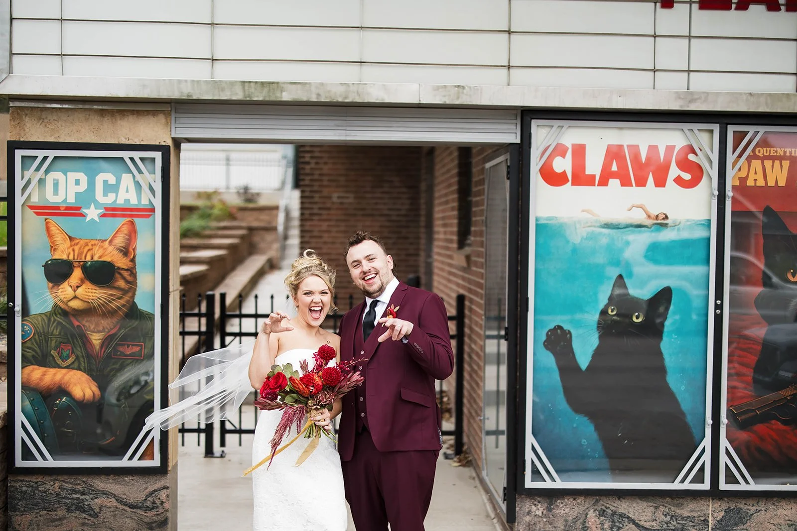 During a late-night scroll session I stumbled upon the most delightful Etsy shop featuring iconic blockbuster film posters reimagined with cats as the “stars.” They were the perfect blend of cinematic nostalgia and playful personality: unexpected and completely on brand for a theater wedding with a few proud cat lovers at the center of it all. And amazingly enough, I kept it a secret from our couples so they’d be completely surprised when they arrived. And boy, were they ever!